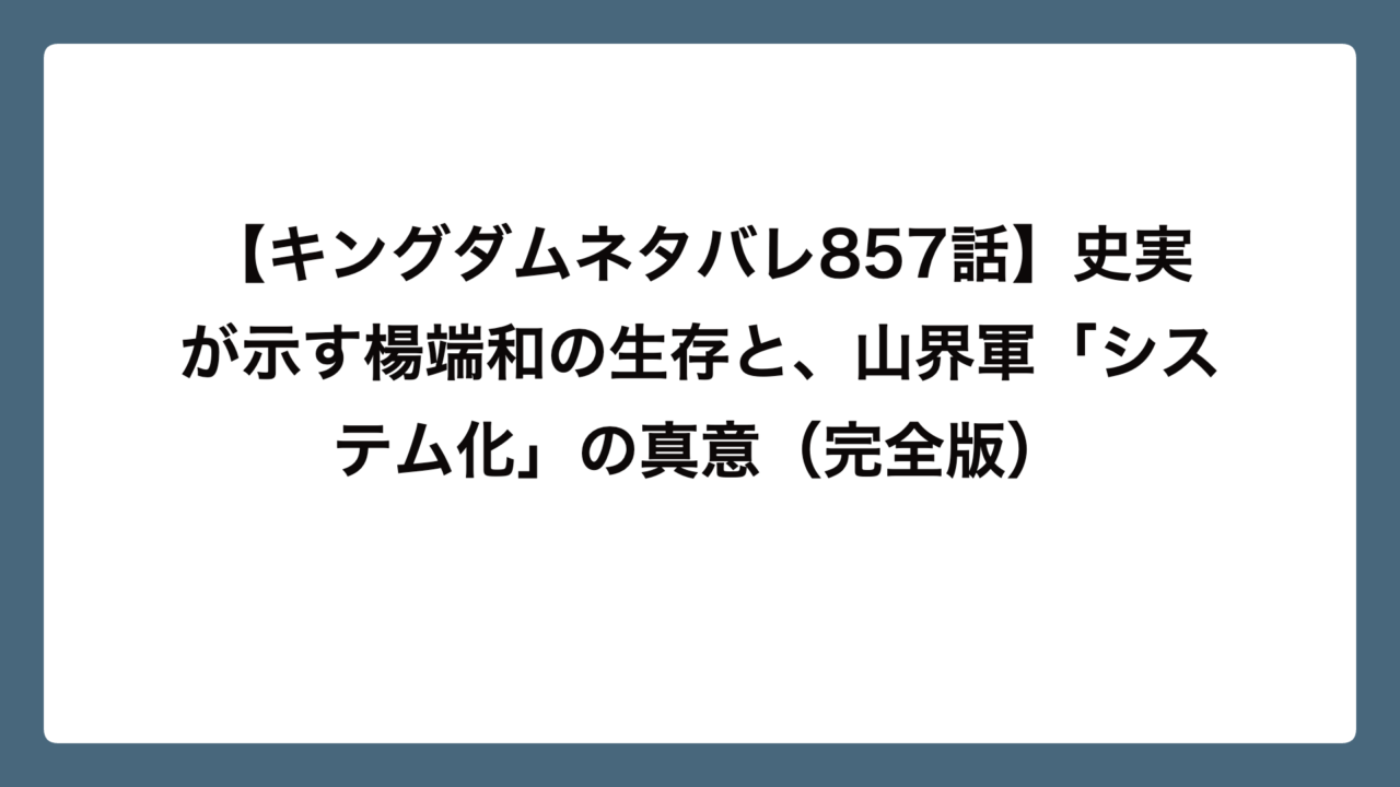 第857話の展開は、楊端和ファンにとっては辛いものでしたが、史実と組織論の視点で見れば、決して絶望的な状況ではありません。むしろ、秦軍が次のステージへ進むための必要なステップです。